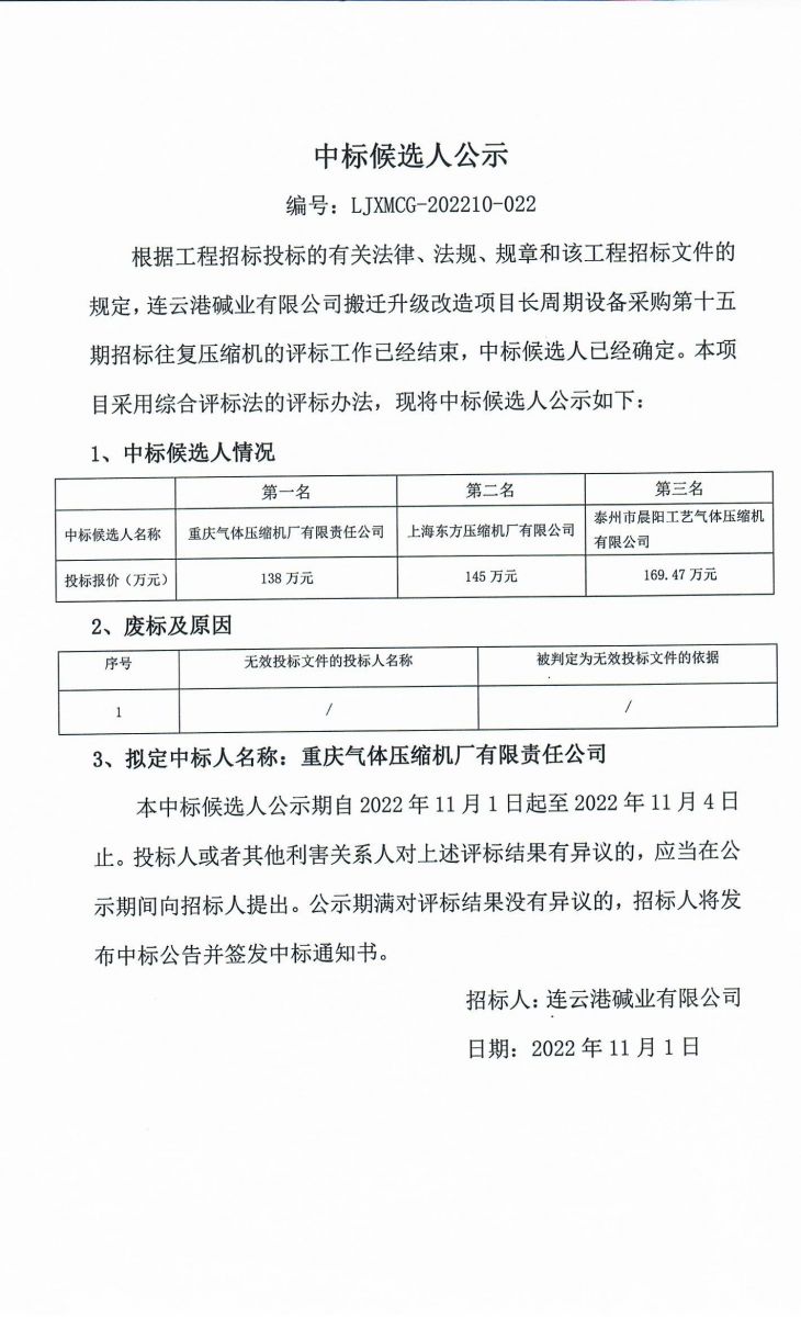 往復(fù)壓縮機采購招標(biāo)中標(biāo)候選人公示