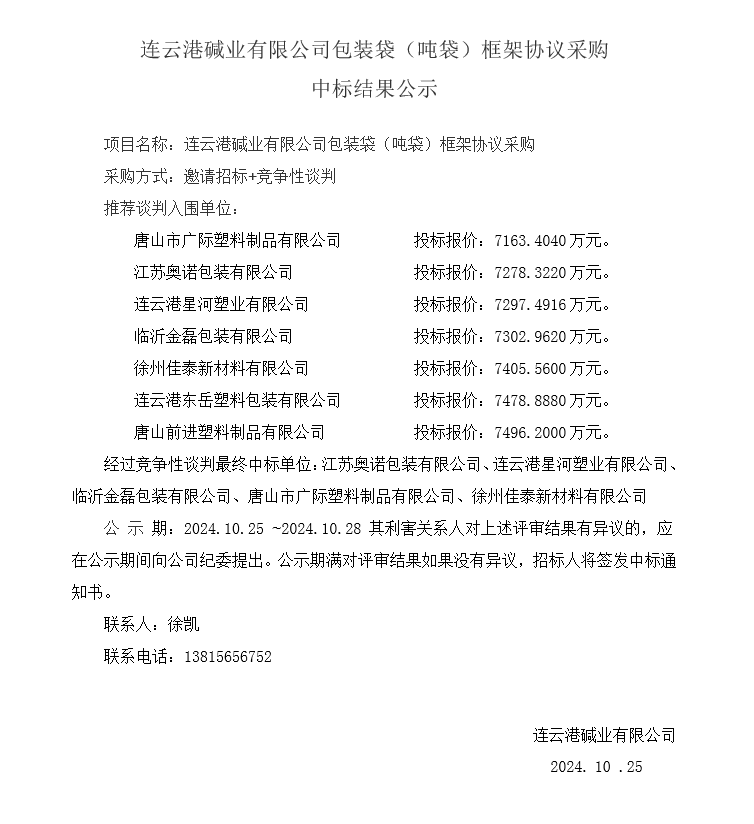 連云港堿業(yè)有限公司包裝袋(噸袋)框架協(xié)議采購中標(biāo)結(jié)果公示