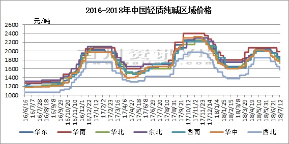 百川資訊:本周(2018.7.05-7.12)國(guó)內(nèi)純堿主流下調(diào)仍以100-200元/噸為主。輕質(zhì)純堿用戶(hù)需求不佳,各純堿企業(yè)議價(jià)接單,價(jià)格靈活下調(diào)100-200元/噸不等。重質(zhì)純堿方面:在沙河區(qū)域重質(zhì)純堿月初連續(xù)下降300元/噸后,本周下游玻璃用戶(hù)持續(xù)壓價(jià),價(jià)格繼續(xù)下調(diào)100-150元/噸。受沙河區(qū)域大幅下調(diào)影響,西北、西南、華中、華東等地重堿用戶(hù)紛紛跟降下調(diào)100-200元/噸成交,且部分下游用戶(hù)采購(gòu)以月底結(jié)算價(jià)執(zhí)行采購(gòu)。近期市場(chǎng)表現(xiàn)欠佳,一方面因生產(chǎn)供應(yīng)的充足影響,另一方面來(lái)源于價(jià)格的下行趨勢(shì),加上輕重質(zhì)純堿價(jià)格倒掛影響,輕堿采購(gòu)量謹(jǐn)慎,成交重心加速下調(diào)。西北、華中區(qū)域純堿廠家輕重質(zhì)純堿出售價(jià)格逼近成本低位,下游用戶(hù)采購(gòu)量難有提振,整體市場(chǎng)價(jià)格多以靈活調(diào)整為主。