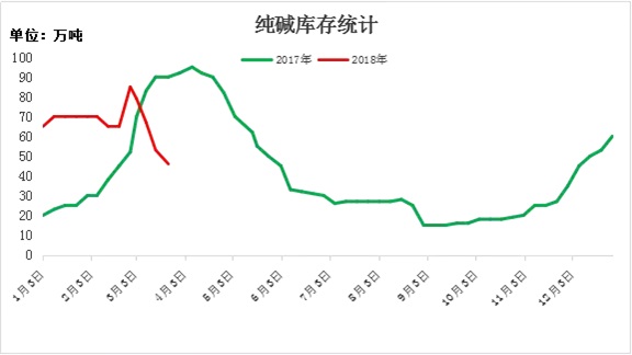 3月,對于純堿市場來說注定不平凡,純堿走勢意料之外,但又在情理之中。月初,輕質(zhì)堿報價在出廠報價在1600元/噸,重質(zhì)堿采購報價在1650元/噸。月底,輕質(zhì)堿報價1850元/噸,重質(zhì)堿采購報價1800元/噸。輕質(zhì)上漲250元/噸,漲幅15.63%,重質(zhì)堿漲幅150元/噸,漲幅9.09%。去年3月末,輕質(zhì)堿出廠報價在1600元/噸,重質(zhì)堿報價在1850元/噸。今年同期價格輕質(zhì)高于去年,重質(zhì)基本與去年持平。2017年3月處于低迷走勢,廠家有庫存壓力,出貨緩慢,下游采購心態(tài)欠佳,按需進貨為主,月底庫存在90萬噸,部分企業(yè)存在脹庫。今年,截止到3月22日庫存維持在46萬噸,減少44萬噸,降幅49%。3月,同樣的時間,不一樣的純堿走勢。