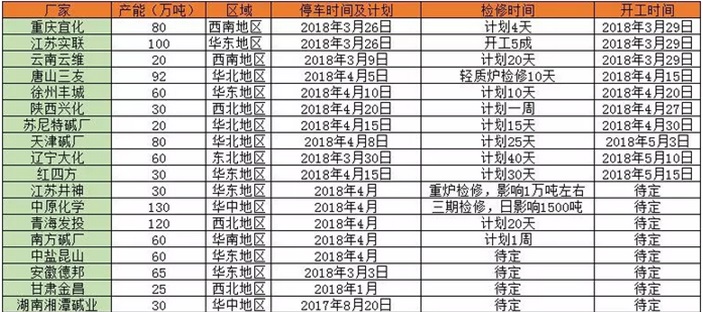 其次,堿廠提前檢修,產(chǎn)量下降。2017年2月份均開工率在85%,3月開工在86.5%。2018年2月份均開工率78.66%,3月份開工在76.9%。2017年1-2月純堿的產(chǎn)量448.3萬噸,2018年1-2月份產(chǎn)量在432.4萬噸,減少15.9萬噸,降幅3.55%。