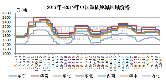 百川資訊:重質(zhì)純堿送到價(jià)格走勢(shì)圖(注:西北出廠)(2019.6.28-7.4)