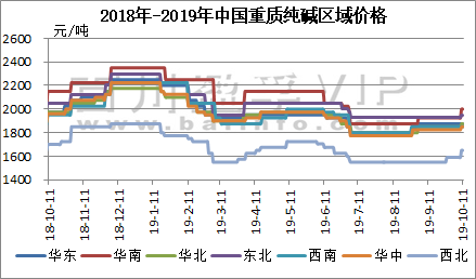 百川資訊:重質(zhì)純堿送到價(jià)格走勢圖(注:西北出廠)(2019.9.30-10.11)