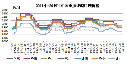 百川資訊:重質(zhì)純堿送到價格走勢圖(注:西北出廠)(2019.8.2-8.8)