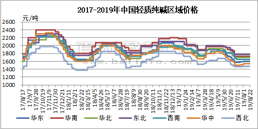 百川資訊:輕質(zhì)純堿出廠價格走勢圖(2019.8.16-8.22)